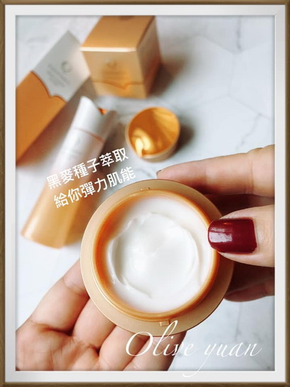 另外乳霜的部分,我入手的是抗老系列的金罐—「盈潤緊緻煥肌霜」(台灣目前尚未販售),成分中一樣有添加「三重保水鏈」,還有讓肌膚發揮彈力肌能的「黑麥籽萃取」,加上「芍藥萃取、越莓葉萃取」等14種高保濕成分,然後香味是一系列的。