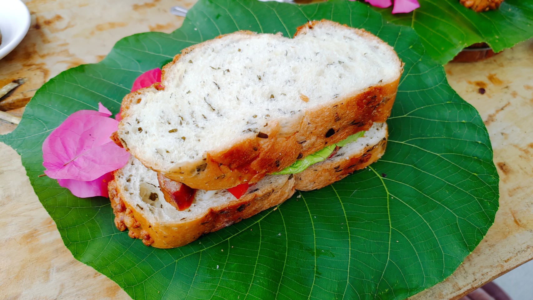 刺蔥佛卡夏下面的月桃葉和旁邊的花瓣,都是一點完餐,老闆娘就去旁邊現摘的,一整個產地直送!這個佛卡夏麵包體非常軟,不太像我們認知的佛卡夏,不過