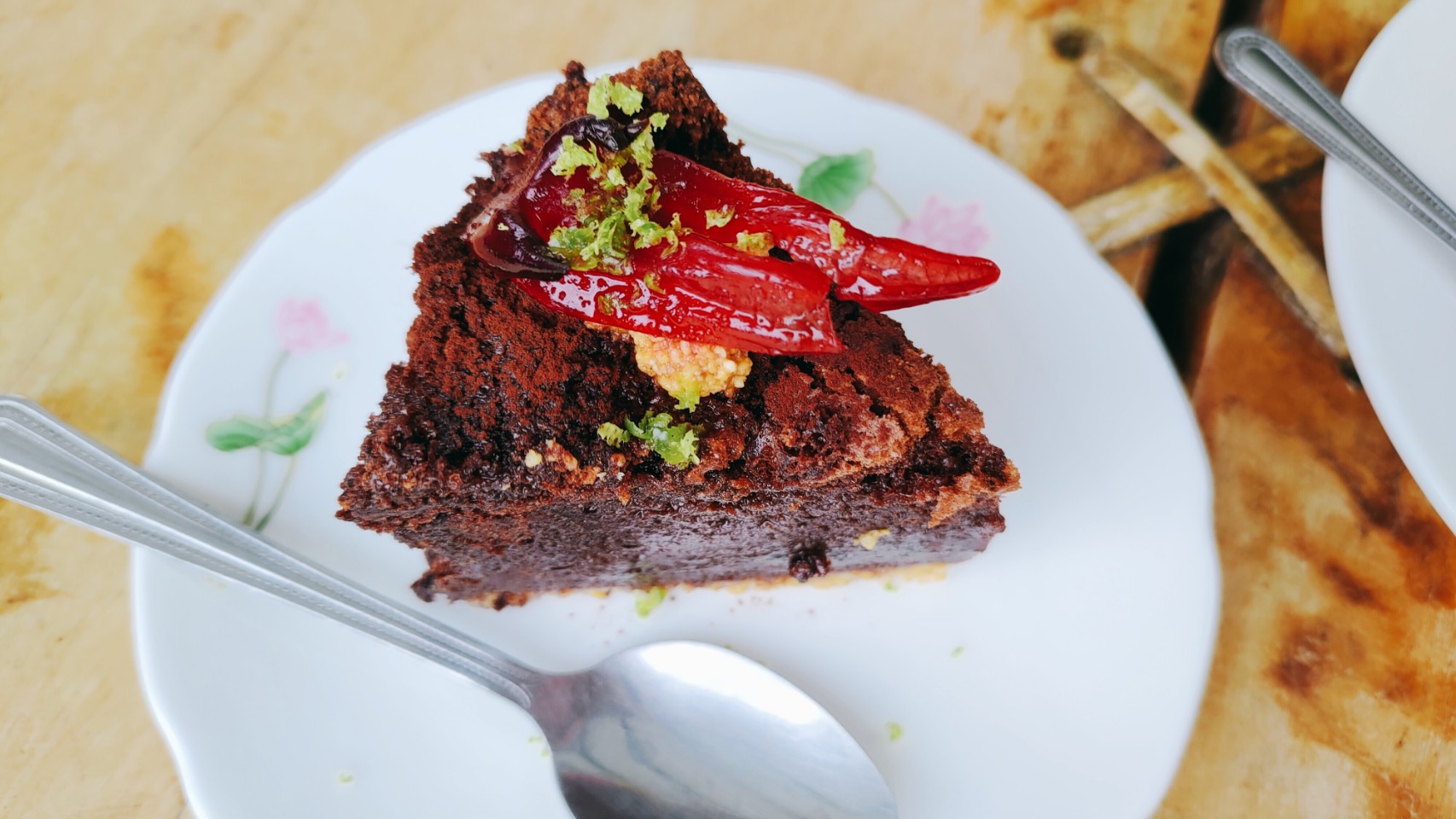 上餐時老闆娘開玩笑說:「這是不朗你想怎樣~」,好愛原住民與生俱來的幽默感XD!這個布朗尼整體偏濕潤,大概是因為加入很多小米酒的關係,因為這塊但酒味真的濃~